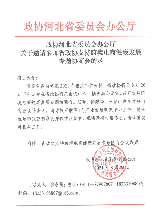 8月26日,省政协支持跨境电商健康发展专题协商会在石家庄召开。省政协副主席徐建培,省政协常委、港澳台侨和外事委员会主任安国富,省政协常委、民建河北省委专职副主任范社岭等出席会议。民建省委委员、我院电子商务系张亚明教授受邀代表民建河北省委参加会议。