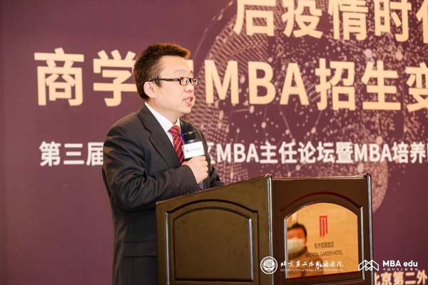 论坛以“后疫情时代,商学院MBA招生变革与机遇”为题,由北京第二外国语学院MTA/MBA中心主任骆欣庆教授主持。北京第二外国语学院校长助理邹统钎教授,社科赛斯考研总裁兼党支部书记、中国MBA教育网总裁李发进先生,教育部高等教育出版社管理分社社长、副编审郭金录社长进行开幕致辞,对到场嘉宾及院校表示热烈欢迎与感谢。