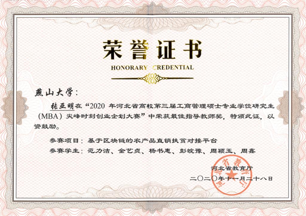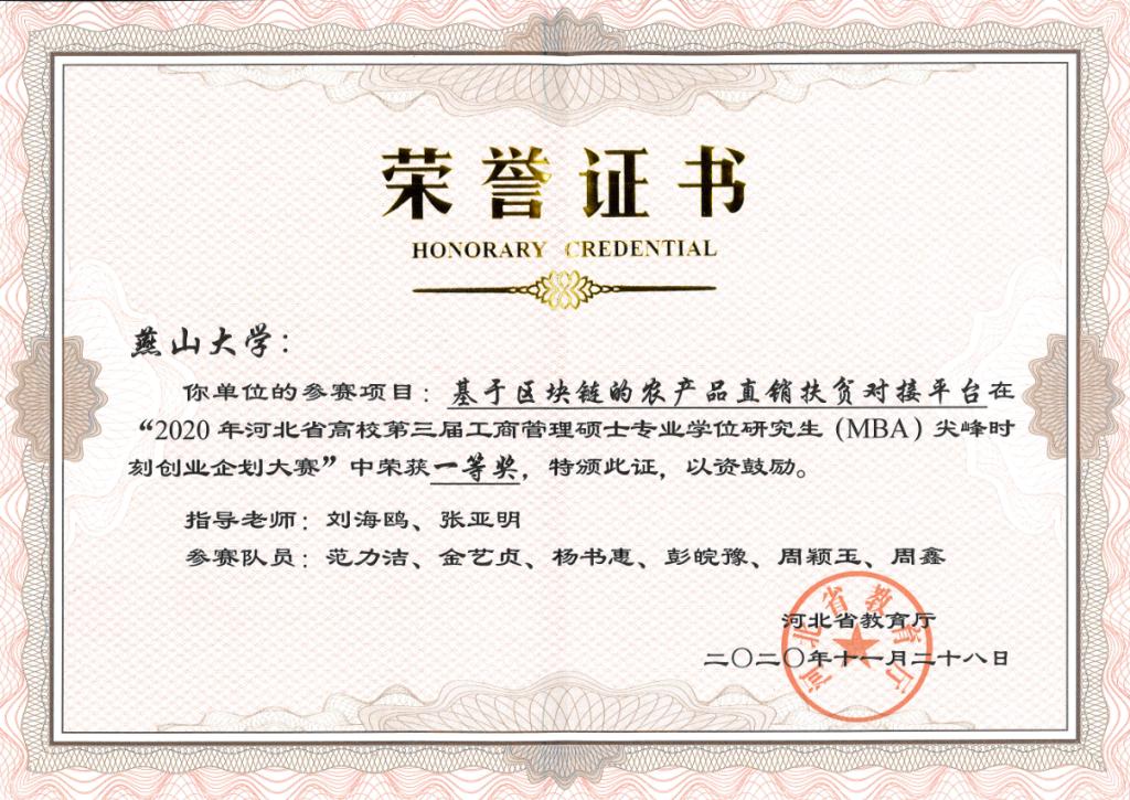 本次竞赛由河北省教育厅主办,河北省经管研究生教育指导委员会协办,河北工业大学承办。竞赛于10月份正式拉开帷幕,分为校内初赛、河北省专家函评复赛和河北省决赛三个阶段,共有燕山大学、河北工业大学、河北大学、河北科技大学、河北师范大学等10个高校的53支队伍的报名参赛,最终18支参赛队晋级决赛。决赛采用了“线上+线下”的形式举办。经过决赛队伍的精彩展示,评委老师综合各参赛团队的商业计划书和现场展示,评定出了本次比赛的获奖项目。我校张亚明教授、刘海鸥副教授指导的《基于区块链的农产品直销扶贫对接平台》荣获一等奖,许孝君副教授指导的《小象无忧-求职合租找室友》、王宏艳副教授指导的《云“智”愿——高考志愿填报行业引领者》获得二等奖,陈晶璞教授指导的《倾心家庭服务APP》、王玖河教授指导的《基于51单片机的光伏智能养花系统》、许孝君副教授指导的《南平市红色研学旅游产品设计与开发》获得三等奖。张亚明教授获得比赛最佳指导教师奖。