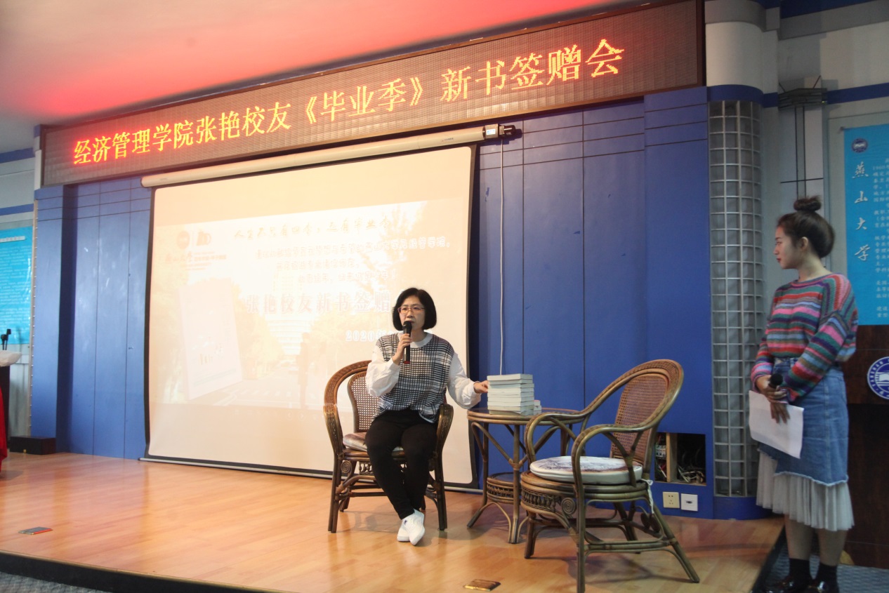 签赠会上,张艳对同学们的问题热心回答。她首先感谢了同学们的热情欢迎。《毕业季》是以燕山大学为背景,她相信燕大曾经的样子,也会给同学们带来一些感想。针对同学们人生方向的迷茫,她说如果不知道自己未来要做什么,就把手下正在做的事情做好,那么一件接一件都做好了,那等你回头看的时候,你其实已经把未来安排好了。