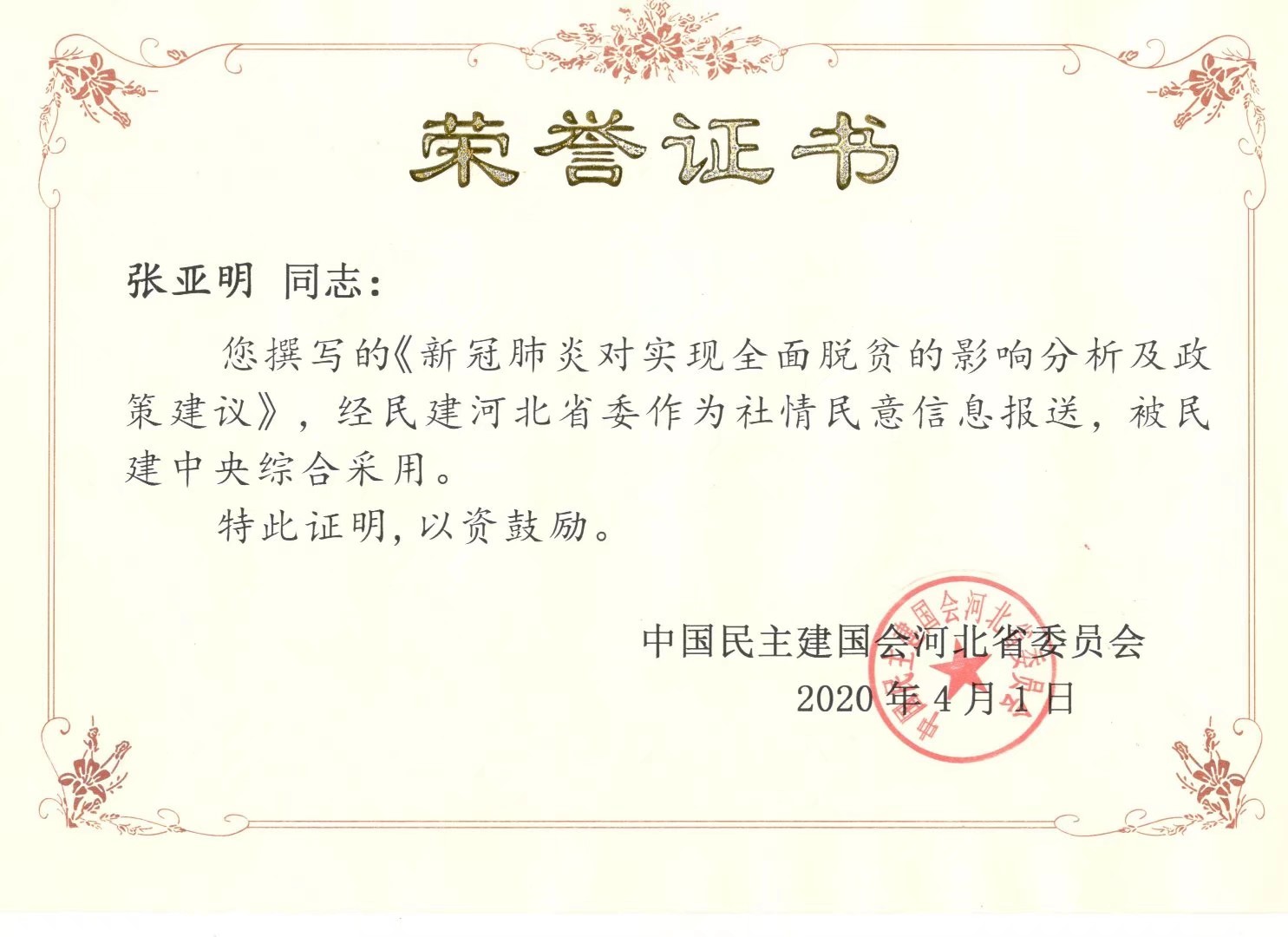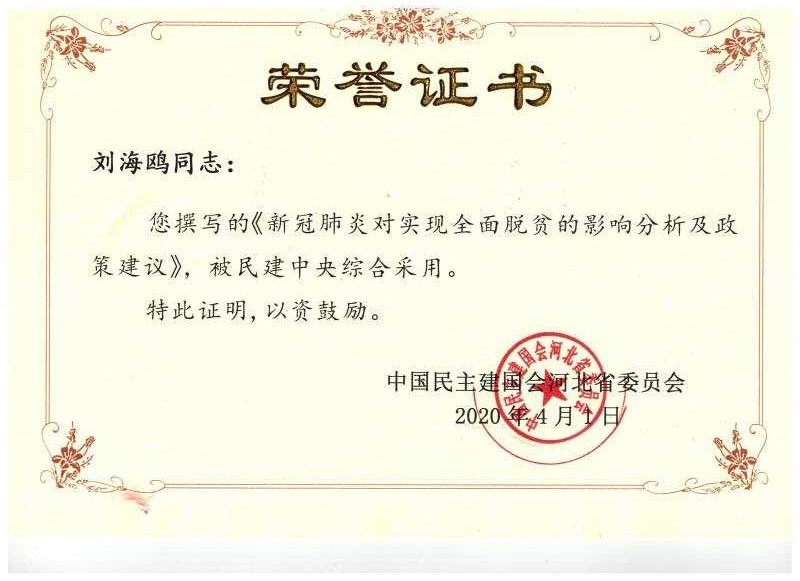 4月1日,我院永利集团yl6809官网教师张亚明教授、刘海鸥副教授撰写的智库报告《新冠肺炎对实现全面脱贫的影响分析及政策建议》再次被民建中央采用,这是张亚明教授科研团队第五篇被民建中央采用的智库报告,实现了建言资政新的突破。