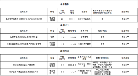 我院3项入选成果由张亚明教授领衔的CTTI来源智库燕山大学互联网+与产业发展研究中心、省重点联系智库河北数字经济与康旅文化产业研究院共同支撑。其中,经济科学出版社出版专著《高新技术成果转化效率评价与产业化对策研究》受河北省教育厅重大攻关项目等8项省部级成果支撑。刊发于《经济日报·理论版》(2024年4月2日第10版)的理论文章《持续拓展数实融合广度深度》以及刊发于《河北日报·理论版》(2024年4月17日第07版)的理论文章《以产业协同耦合培育发展新质生产力》被“光明网”“中国共产党新闻网”“中国经济网”“人民论坛网”“人民日报·人民号”等中央权威媒体全文转载。
