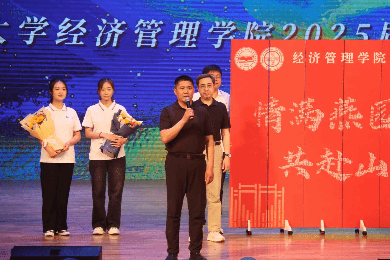 孙红磊、陈晶璞、靖鲲鹏等代表学院接受2025届全体毕业生纪念品捐赠,孙红磊在致谢中讲到,希望全体毕业生