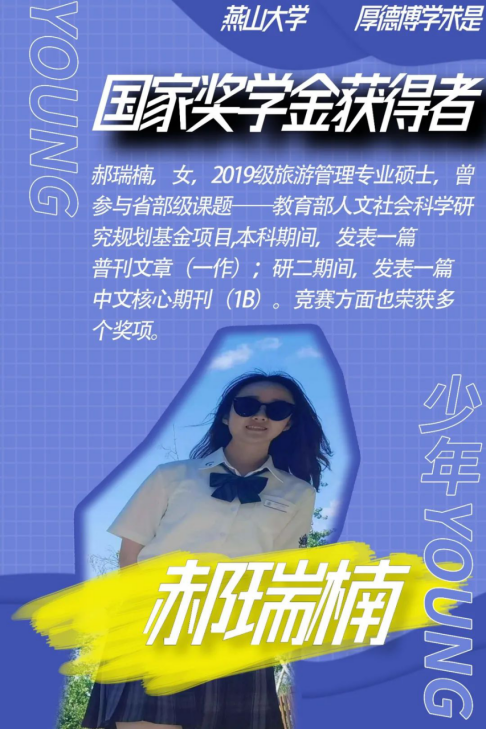 她无论是在生活和学业上都有着不俗的成绩。在科研学习上,曾参与省部级课题——教育部人文社会科学研究规划基金项目“高铁条件下京津冀区域旅游效率分析及协同提升路径研究”,本科期间,发表一篇普刊文章(一作);研二期间,发表一篇中文核心期刊(1B)。竞赛方面也荣获多项奖状:2020-2021年硕士研究生国家奖学金、第三届全国大学生旅游设计大赛二等奖、全国大学生金融精英挑战赛优秀奖、燕山大学“志愿杯”演讲比赛三等奖、河北省冀青工作调研大赛一等奖、河北省“调研河北”大赛一等奖、全国移动互联网创新大赛华北赛区铜奖、燕山大学“食光正好,拒绝盛宴”图片类作品二等奖、燕山大学第二届“我和我的祖国”主题文化活动“最佳作品奖”、第七届河北省“互联网+”大学生创新创业大赛金奖。