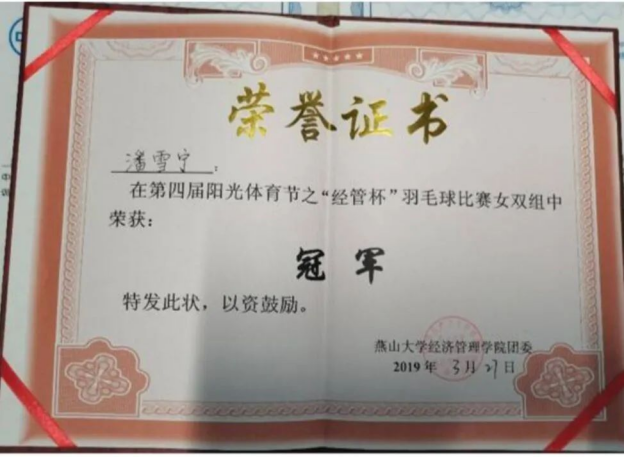 她在校园活动方面积极踊跃,在2019-2020学年,获得“燕大杯”校排球比赛女子组第二名的成绩;获得“经管杯”羽毛球女子双打第一名、女子单打第四名的成绩。疫情期间,她自愿作为社区志愿者,协助疫情的防控工作。与此同时,她还参与了冀台两岸交流会“志愿者活动、燕山大学百年校庆志愿服务工作。