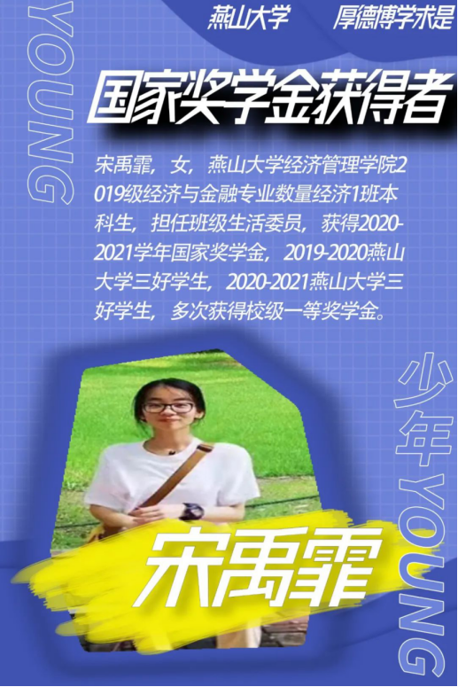 宋禹霏,女,永利集团yl6809官网2019级经济与金融专业数量经济1班本科生,担任班级生活委员,获得2020-2021学年国家奖学金,2019-2020燕山大学三好学生,2020-2021燕山大学三好学生,多次获得校级一等奖学金。