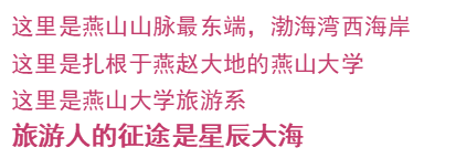 这里是燕山山脉最东端的起点,这里是渤海湾的西海岸,这里是扎根于燕赵大地的燕山大学。这里有以“星辰大海”为征途、以“知美 乐行 守正 习新”为系训的燕大旅游系。