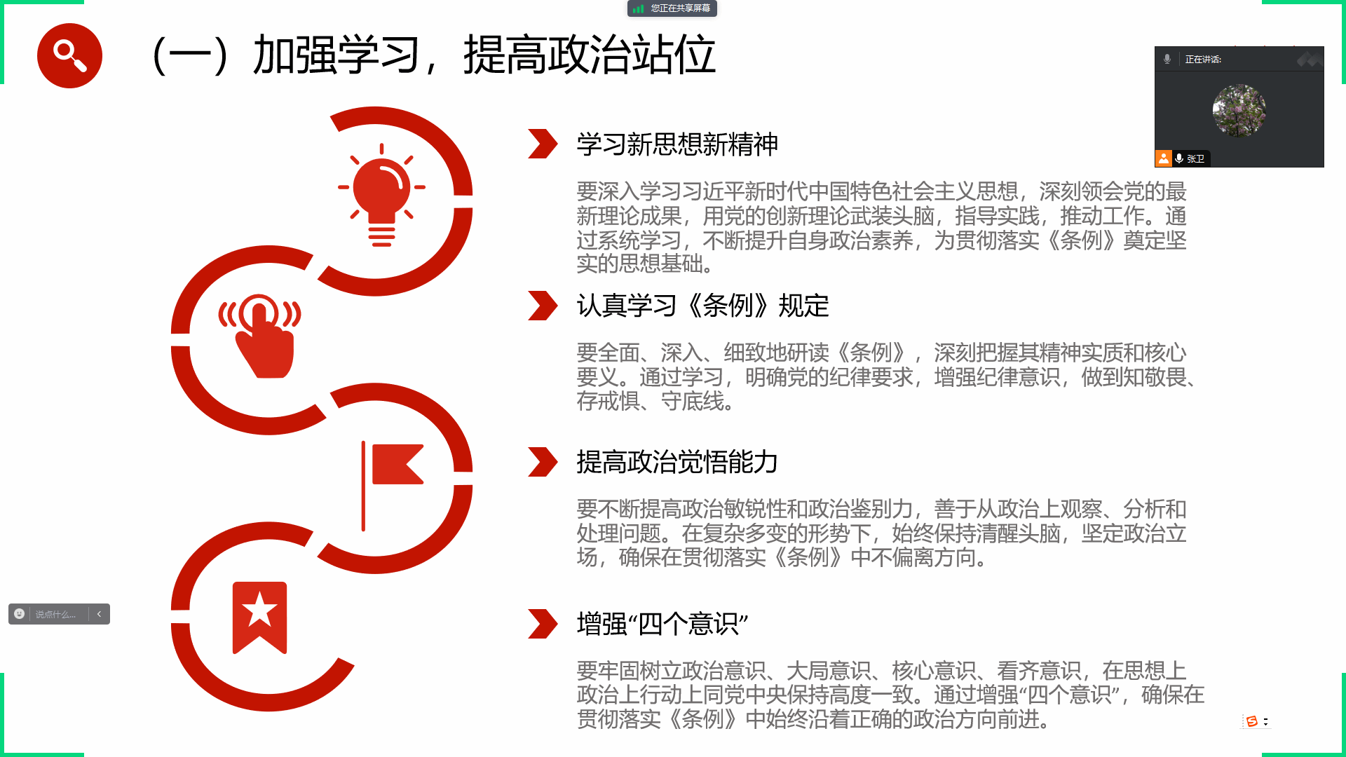 为深入学习贯彻修订后的《中国共产党纪律处分条例》,努力在学纪、知纪、明纪、守纪上有新进步新提升,进一步强化纪律意识、加强自我约束、提高免疫能力,始终做到忠诚干净担当。永利集团yl6809官网机关党支部于2024年5月12以线上集中学习的形式开展了“学条例,强自律”主题党日活动,党支部书记张卫主持会议。