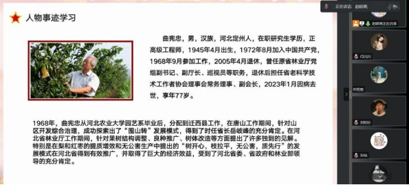会上,支部党员共同学习了曲宪忠同志无私奉献、勇于担当,将毕生精力献给林果产业和乡村振兴事业的先进事迹。曲宪忠同志扎根国家扶贫工作重点县威县,躬耕不辍,十年如一日奔波在10万亩梨园上,帮助8万余名群众脱贫致富,带领群众把贫瘠的沙荒地变成致富的“聚宝盆”。曲宪忠同志始终坚持中国共产党员的初心使命,与群众感情质朴深厚,用实际行动全诠释了“为党的事业奋斗终身”的峥峥誓言,是习近平新时代中国特色社会主义思想的坚定信仰者和忠实实践者,是广大党员干部学习的榜样。