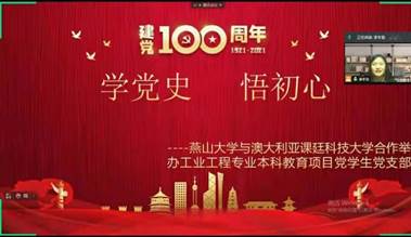 2021年6月18日,燕山大学与澳大利亚科廷科技大学合作举办工业工程专业本科教育项目学生党支部开展了“学党史、悟初心”活动,通过重温入党誓词、学习《论中国共产党历史》中的重要篇章,增强党支部全体党员以及预备党员的党性意识和践行意识,能够不忘初心、牢记使命。