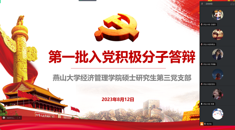 为进一步贯彻落实习近平总书记提出的“学思想、强党性、重实践、建新功”的主题教育总要求,推动支部党员和入党积极分子在主题教育中感悟思想伟力、凝聚奋进力量,为党员队伍的壮大把好质量关,选出纪律严明、信念坚定的入党积极分子成为发展对象,永利集团yl6809官网硕士研究生第三党支部于8月12日14:00—17:00于线上腾讯会议开展了入党积极分子答辩会。支部的38名入党积极分子参加此次答辩,4名支委及各党小组推荐的共10名党员同志担任答辩会评委。