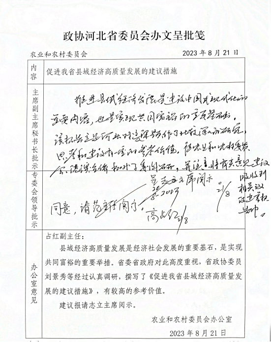 高志立副主席在批示中指出,推进县域经济发展是建设中国式现代化的重要内容,也是实现共同富裕的重要基础。该报告立足河北对这一课题做出了比较深入的研究,思考和建议有一定的参考价值。