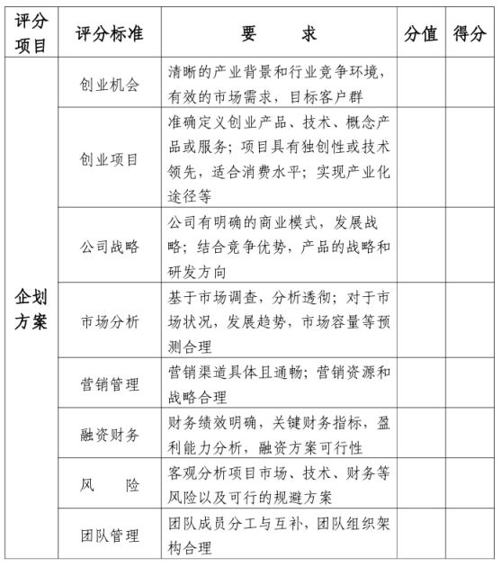 参赛项目不限类型,可以是新产品、新技术、新服务、新业态、新模式等,鼓励各类创新创业项目参赛。参赛作品以商业计划书和商业路演PPT的形式提交。项目评分标准如下: